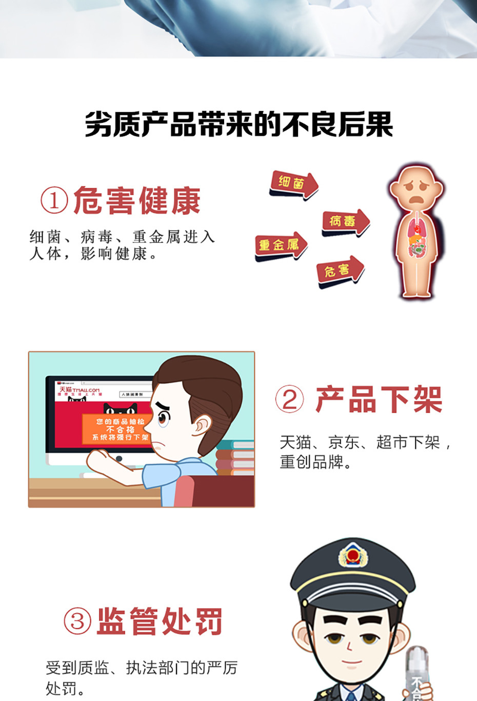 嚴(yán)謹(jǐn)出精品!嚴(yán)格按照GMP生產(chǎn)規(guī)范!生產(chǎn)前原材料檢測,確保原料合格。生產(chǎn)中半成品檢測,確保生產(chǎn)過程無污染。生產(chǎn)后產(chǎn)品檢測并且出具出廠檢測報告,確保產(chǎn)品符合標(biāo)準(zhǔn),從原料到成品層層把關(guān),確保每一件均為精品。不怕被質(zhì)監(jiān)部門、電商平臺抽檢!